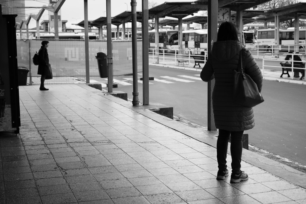 Znovu jsem si ověřila, že se necítím komfortně, když se na mě někdo přímo dívá. Tím pádem padají všechny ty dohady o tom, jestli uživím kreditkoidní fotoaparátek typu Ricoh GR, který by vypadal jako hračka a neřval na ostatní, že kolem nich zrovna prošel fotograf. Padají jakékoliv úvahy o tom, jestli jsem schopná s jakýmkoliv fotoaparátem pořídit fotku člověka, který se kouká přímo na mě. Stála jsem na zastávce a na protější straně cesty na mě civěl chlap, který čekal na autobus na jiném nástupišti. Já jsem viděla v zákrytu dvě ženské postavy, které jsem si chtěla vyfotit jako opakující se motiv. Nakonec jsem musela udělat dva kroky dozadu, toho koukajícího chlapa si pro svůj úhel pohledu schovat za sloup a teprve pak jsem byla schopná udělat ten snímek dvou žen. A jo, fotku toho chlapa jsem zvládla taky, ale z pochopitelných důvodů ji sem dávat nebudu.